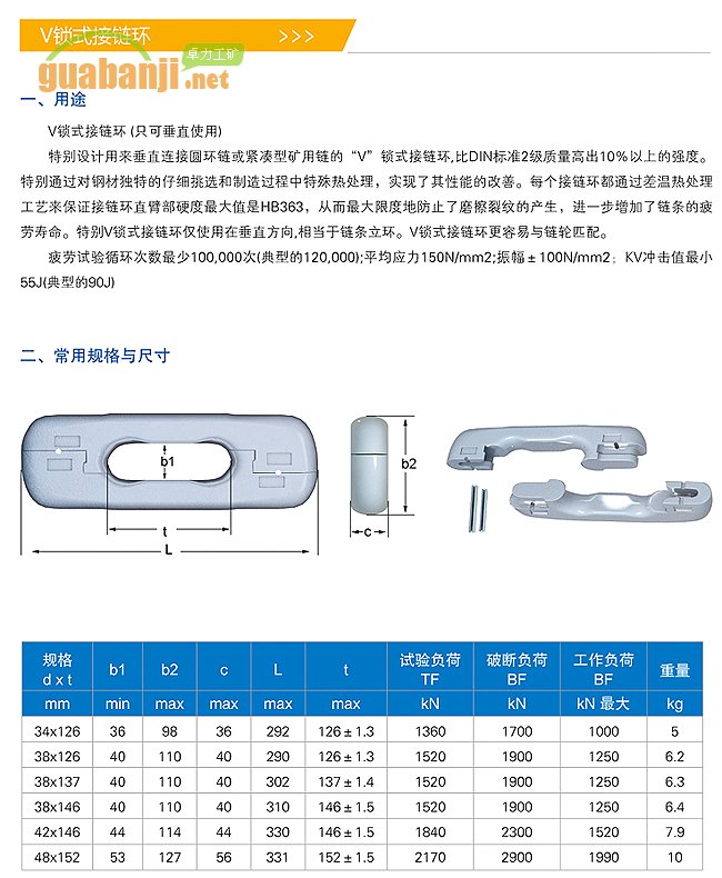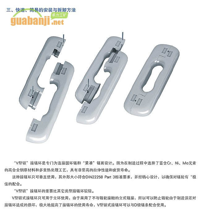 特別設計用來垂直鏈接圓環鏈或緊湊型礦用鏈的v鎖式接鏈環,比DIN標準2級質量高出10%以上的強度。